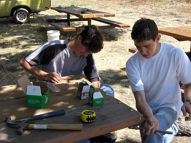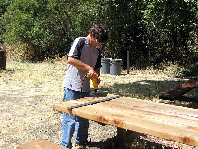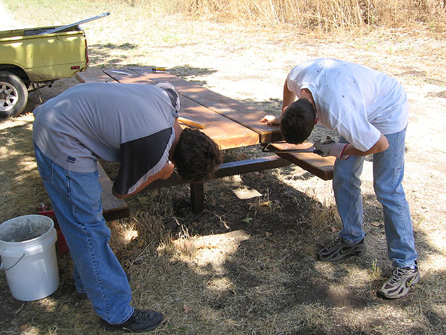 fixing warped ends of the picnic tables in the new equestrian area at