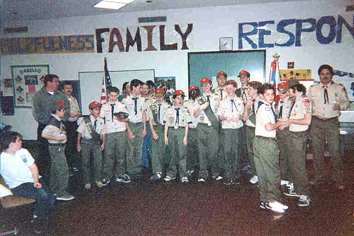 Court of Honor March 15, 2000 The first order of business that evening was officially recognizing our new Troop Officers; lead by Max L. as SPL, Joseph G. and Philip P. as ASPL, and Stephen E. as Troop Historian. A Webelos Patrol from Pack 273 were the troops official invited guests. Wayne Barnes, our founding Scoutmaster, was presented with a long over due Black Troop Adult Neckerchief. After receiving the neckerchief Wayne presented Troop 110's 2000 Charter to committee Chairperson Marilyn Epps. Wayne also wanted the entire troop to stand for a surprise uniform inspection. After the inspection, including a finger nail inspection, Wayne presented the troop with a Quality Ribbon for a 100% subscription to Boys Life magazine. Rank Advancements: Two scouts completed the rank of Scout. Jason Y. and Justin S. both from the Roadkill Patrol. Five scouts completed the rank of Tenderfoot. Jeff S., Keith K., Hilton D. from the Lighting Bolts Patrol, and David H., Andrew W., from the Roadkill Patrol. Eight scouts completed the rank of Second Class. Chris G. from the Roadkill Patrol, Nolan K., Allen G. from the Flaming Arrows. JR P., Joe P., Jeff S., Josh S., and Chris M. from the Lighting Bolts. Three scouts completed the requirements for Star Scout. Matthew Y., Eric W., from the Flaming Arrows followed by Stephen E. from the Tigers. Merit Badges: Eighteen Merit Badges were presented to the following scouts: